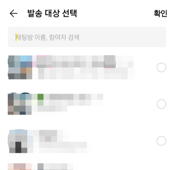 발송 대상 <설정하기>를 클릭하면 채팅창으로 넘어갑니다. 친구목록이 나오지 않습니다. 그동안 한 번이라도 나와 채팅을 하지 않았다면 보낼 수 없다는 뜻이지요.