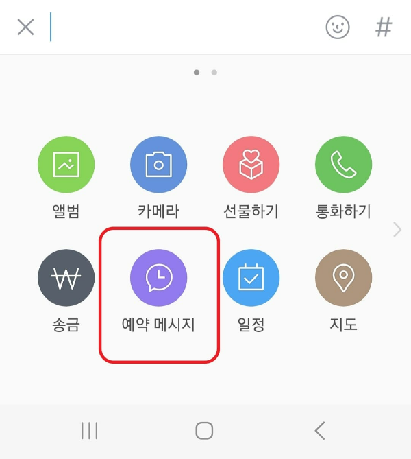 플러스 버튼을 누르면 많은 기능들이 있습니다. 그중에서 <예약 메시지>를 선택해 주세요.