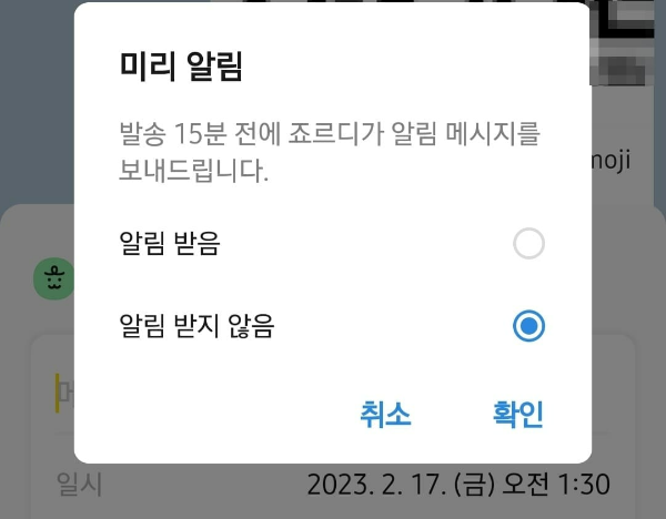 <미리 알림>을 설정해 두면 나에게 발송 15분 전에 예약 메시지가 있다고 한 번 더 알림이 옵니다. 이때 여기서도 메시지 내용을 수정하거나 삭제할 수도 있겠지요? 예약 메시지를 보내고도 자주 깜박한다면 알림 받기를 해두시는 게 도움이 됩니다.