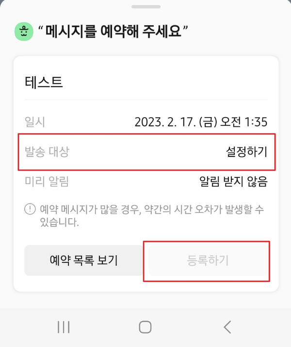 보내는 대상의 채팅창에서 <예약 메시지>를 누르면 <발송 대상>에는 자동으로 상대가 설정되어 있습니다. 그런데 <친구> 목록으로 상대방을 선택해 <예약 메시지>를 하면 <발송 대상>이 설정되어 있지 않습니다. 메세지를 입력해도 <등록하기> 버튼은 비홠성되어 있습니다.