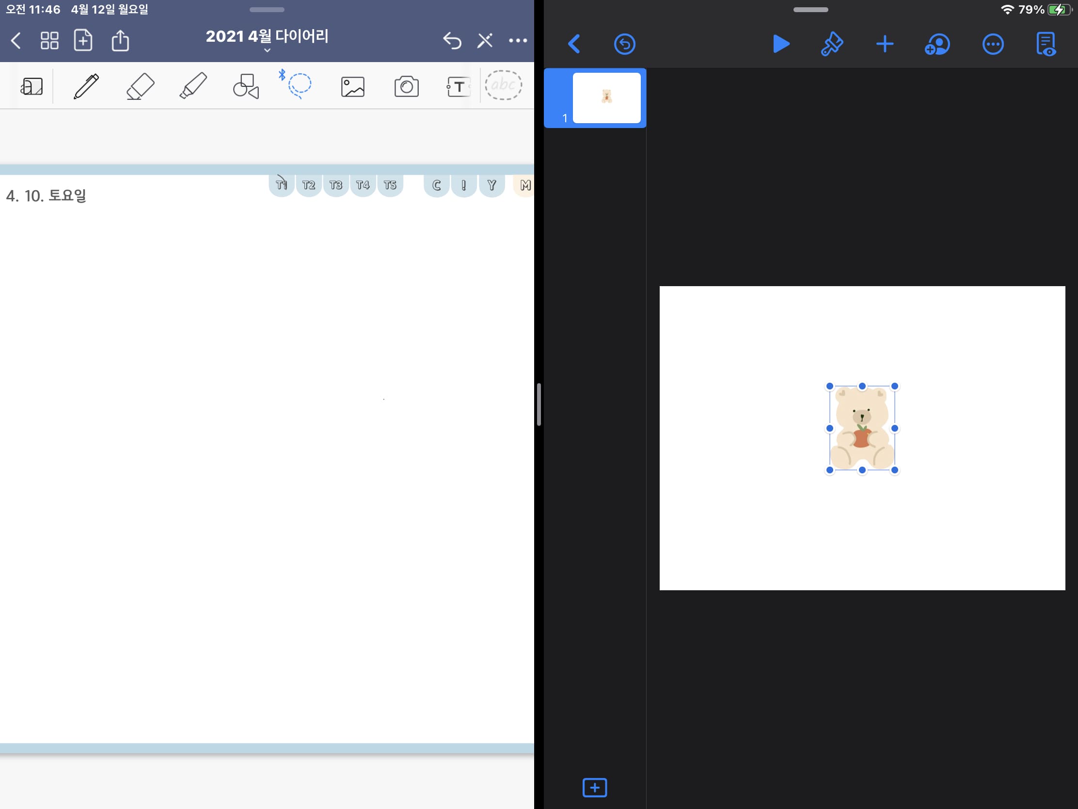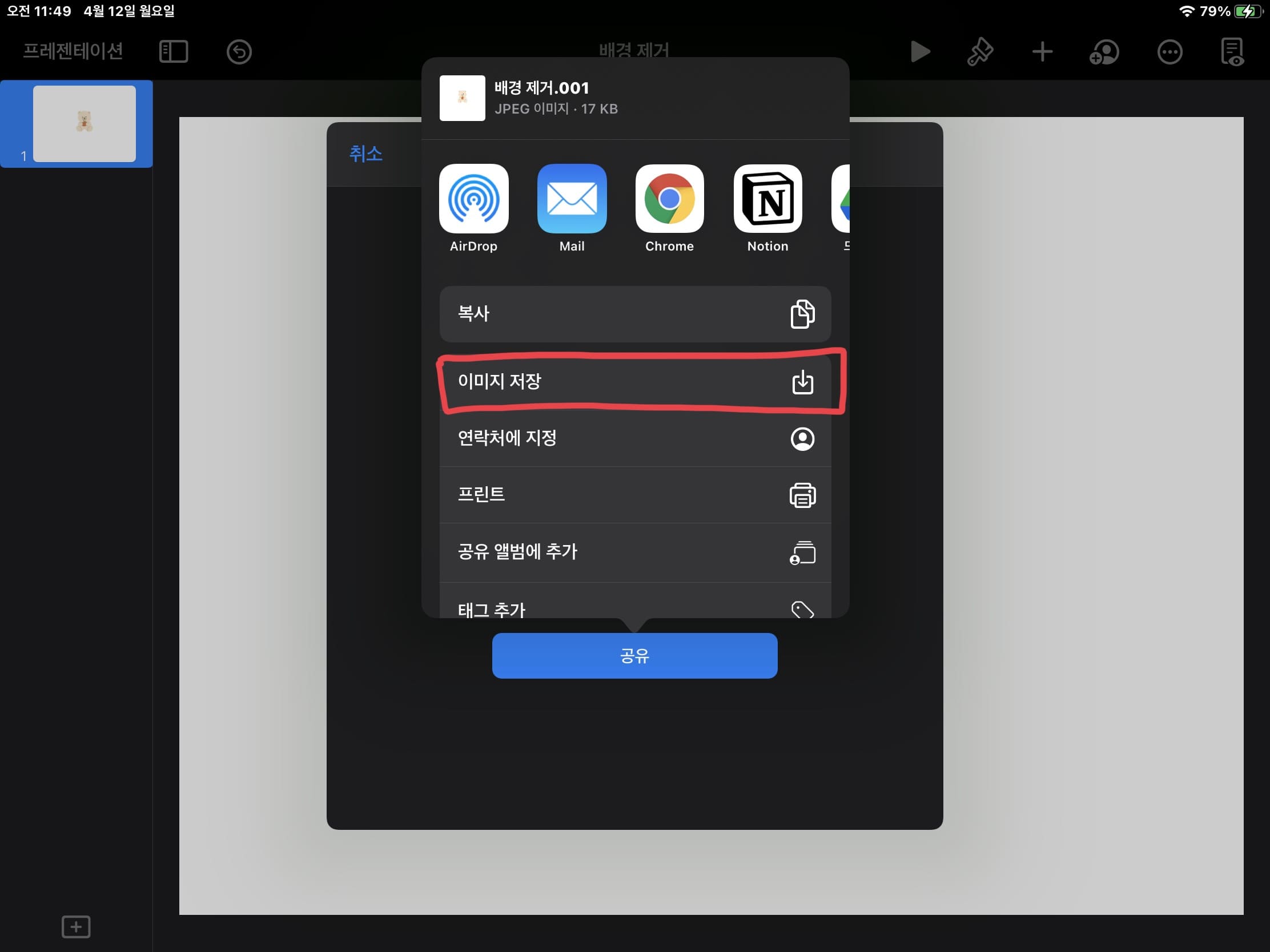 이제 키노트의 이미지를 애플펜슬로 터치하면 이미지가 살짝 띄는 게 보입니다. 그때 키노트로 드래그해서 놓으면 초 간단하게 복사해 사용할 수 있습니다.