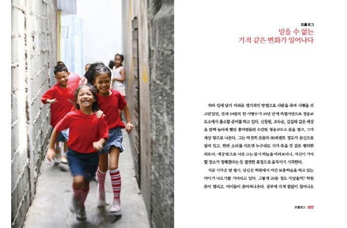 그런 교사의 사랑으로 아이들이 변화되자 지금까지 술과 도박에 빠져 있던 부모들도 변화가 시작했다. 더 이상 절망이 아니라 아이들의 미래와 행복을 나아지게 할 수 있다는 희망이 생긴 것이다. 사람은 오늘보다 내일이 더 나아질 수 있다는 희망이 있어야 한다. 그것만이 오늘의 현실을 받아들이고 움직일 수 있게 하는 힘이기 때문이다,