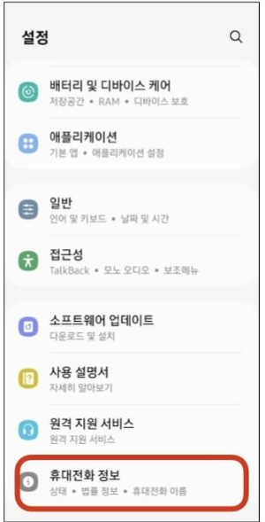 설정에서 맨 아래에 있는 <휴대전화 정보>를 클릭합니다.