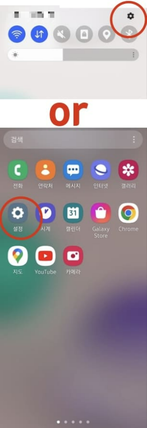 톱니바퀴 모양의 설정을 선택합니다. 스마트폰 초기화면에서 상단을 아래로 내리면 나오기도 하고, 어플에서 선택하셔 됩니다. 내 스마트폰의 대부분 기능은 이 설정에서 해결할 수 있습니다. 모르는 게 있을 때는 일단 이 설정에서 찾아보면 대부분 해결이 됩니다. 어느 경로로 설정을 선택해도 화면은 똑같습니다.
