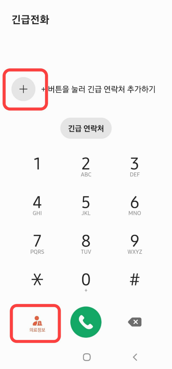 <긴급전화>를 클릭하면 나타나는 화면입니다. 연락처 추가하기와 의료정보를 각각 선택해주세요. 또한 스마트폰 설정 -> 안전 및 긴급을 통해서도 설정 가능합니다.