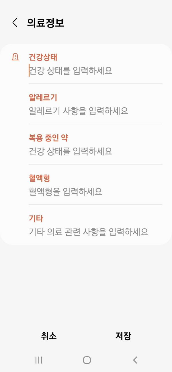 건강상태 알레르기 복용중인 약 혈액형 그리고 기타 사항을 입력해 둘 수 있습니다. 평소에 복용하는 약이나 가지고 있는 질환을 입력해 둔다면 도움이 되겠지요.