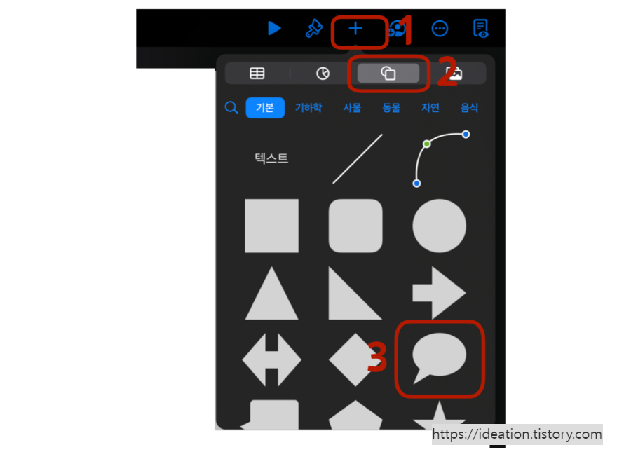 [추가] -> [도형]을 선택하면 활용할 수 있는 다양한 도형이 있습니다. 기본 형태에서부터 사물 동물 음식 기호 예술 직업 장식 등 종류가 참 많지요. 마음에 드는 도형은 [나의 도형]에 추가해 둘 수 있습니다.