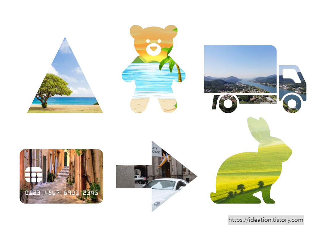 여러 도형으로 응용한 이미지입니다. 만약 사진에 직접 원하는 대로 자르라고 한다면 그림을 못 그려서 저는 못할 것 같습니다. 저처럼 그림에 자신 없어도 쉽게 이미지를 채울 수 있으니 색다른 이미지 만드는 데 좋습니다. 간단한 방법이니 응용해 보세요. 감사합니다!