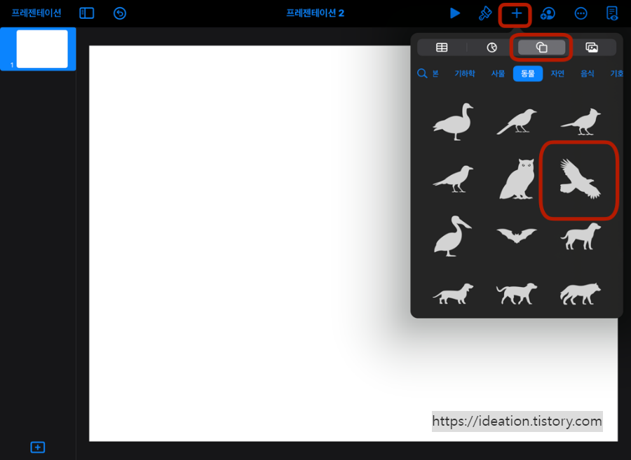 한 가지를 더 해보겠습니다. [도형]- >[동물]에서 독수리를 선택합니다.