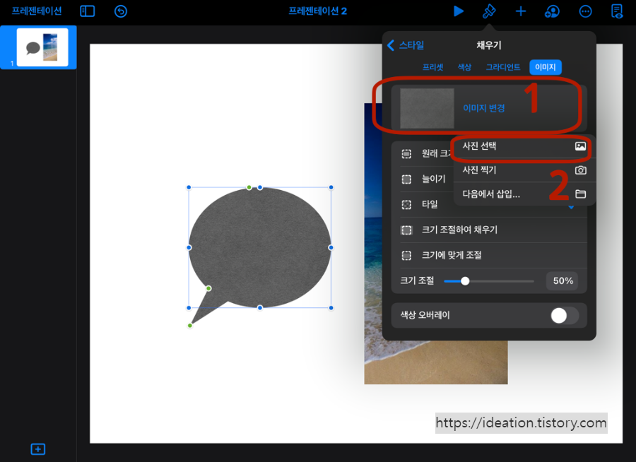 말풍선 도향을 선택했습니다. 바다 풍경 사진과 말풍선 이 두 가지를 이용해서, 말풍선 안에 사진을 채워보도록 하겠습니다.
