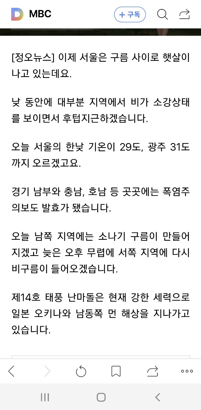 캡처해 둔 오늘의 날씨 기사 일부분입니다. 파일 보관함에서 이미지를 선택하면 세로로 파란 줄 하나가 생기면서 가로로 왔다 갔다 하면서 스캔을 합니다. 프린트로 복사할 때 많이 보셨던 스캔 방식이지요.