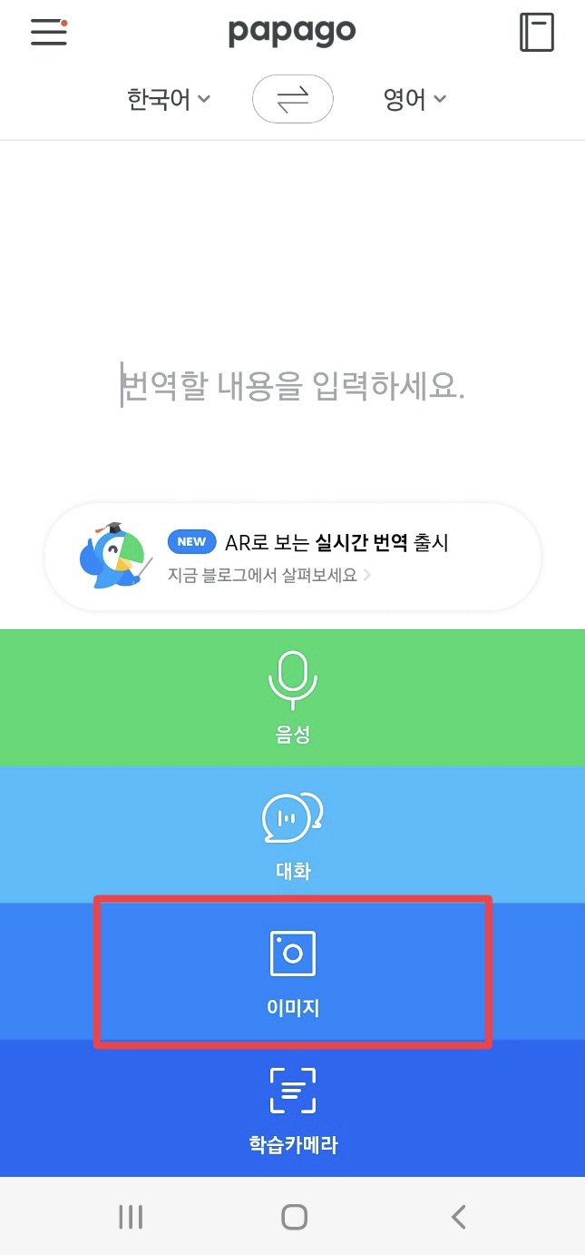 첫 화면입니다. <번역할 내용을 입력하세요> 공간에는 복사하기 해 둔 문장을 불러오기 하셔도 됩니다. 초록색의 <음성>은 직접 말로 하면 됩니다. 지금은 이미지를 번역하는 것이니 <이미지>를 선택해주세요.
