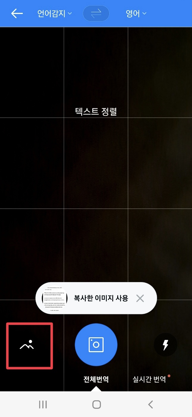 실제 화면에는 검은색 부분에 후면 카메라로 보이는 화면이 바로 뜹니다. 즉 바로 촬영 가능한 모드입니다. <복사한 이미지 사용>은 어플 실행 직전에 클립보드에 저장되어 있는 이미지를 바로 불러오기 합니다. 여기서는 빨간 사각 박스 뷰분을 선택해서 저장된 이미지 파일을 불러오기 합니다.